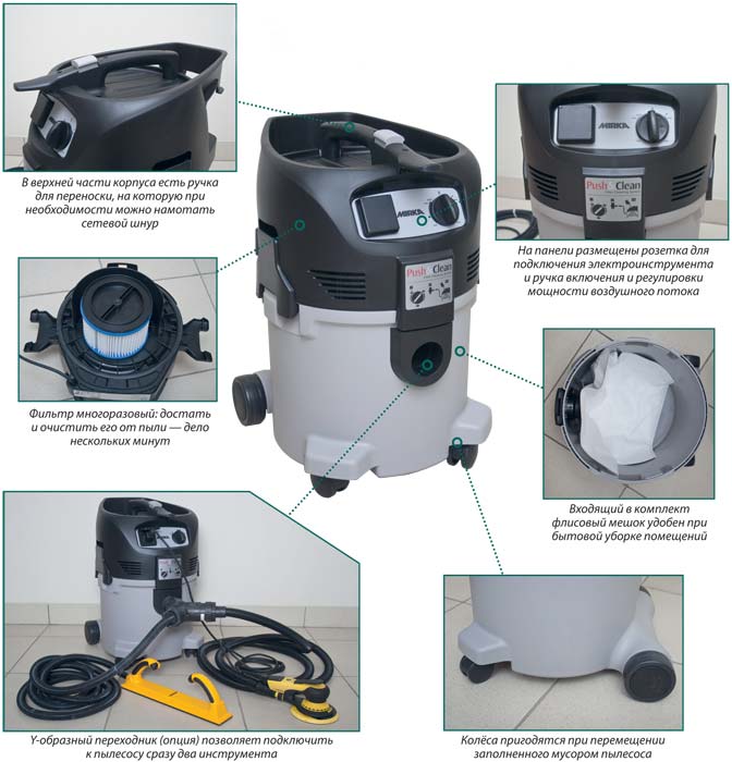 Многофункциональный пылесос «L»-класса VC915 оптимально подходит для комплексного использования с пневмо- и электроинструментами компании Mirka. Об этом говорит, например, такая деталь: у пылесоса предусмотрено штатное место для установки блока питания роторно-орбитальной шлифмашины Mirka CEROS (у неё, в свою очередь, предусмотрен патрубок для подключения пылесоса). Таким образом, блок питания всегда рядом, но нисколько не мешает.