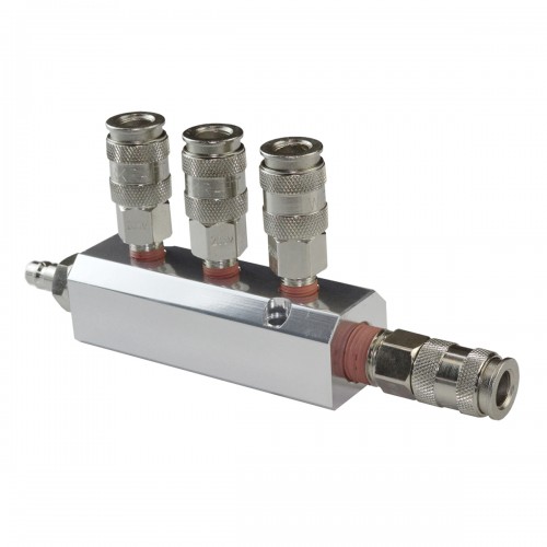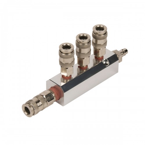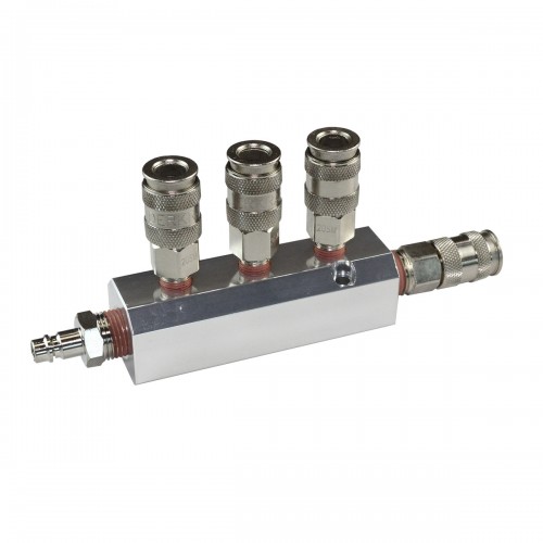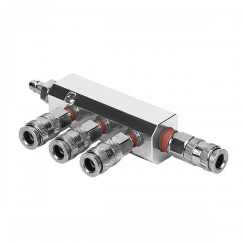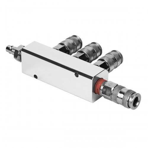 Разветвитель пневматический WIEDERKRAFT WDK-85MB (1/4F). Пневматический стальной разветвитель с вращающимися соединениями предназначен для одновременного подключения до четырех пневмоинструментов к одной пневмосистеме. Он оснащен одним входом с внутренней резьбой 1/4F и четырьмя выходами с быстроразъемными соединениями типа «мама» рапид EURO, обеспечивая высокую пропускную способность, надежность и герметичность.