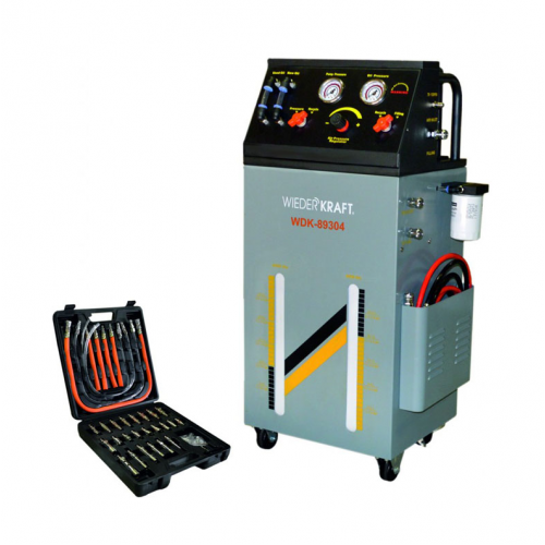 Установка для замены масла WIEDERKRAFT WDK-89304 (30л) предназначена для быстрой и безопасной замены масла в автоматических коробках передач путем замещения старой жидкости новой, а также может использоваться для частичной очистки масла за счет фильтрации через встроенный сменный фильтр, что делает процесс обслуживания более чистым и контролируемым. Оборудование оснащено двумя емкостями по 30 литров для новой и отработанной жидкости, что позволяет выполнять полную замену масла даже в современных автоматических трансмиссиях с большим объемом рабочей жидкости, при этом компактная конструкция и наличие колес облегчают перемещение установки по рабочей зоне сервиса. Пневматический принцип работы и использование сетевого питания для отдельных узлов в сочетании с системой контроля давления и режимами промывки/заправки позволяют обеспечивать стабильное качество сервиса и снижать риск ошибок при обслуживании АКПП.